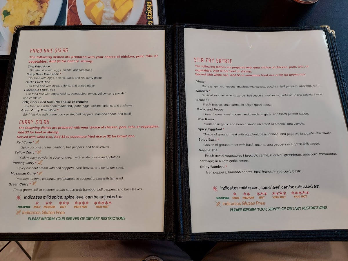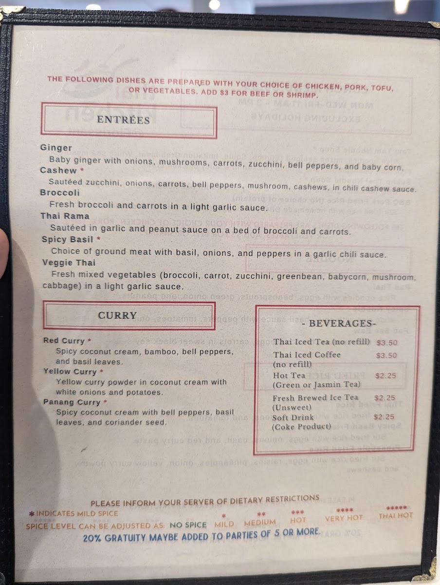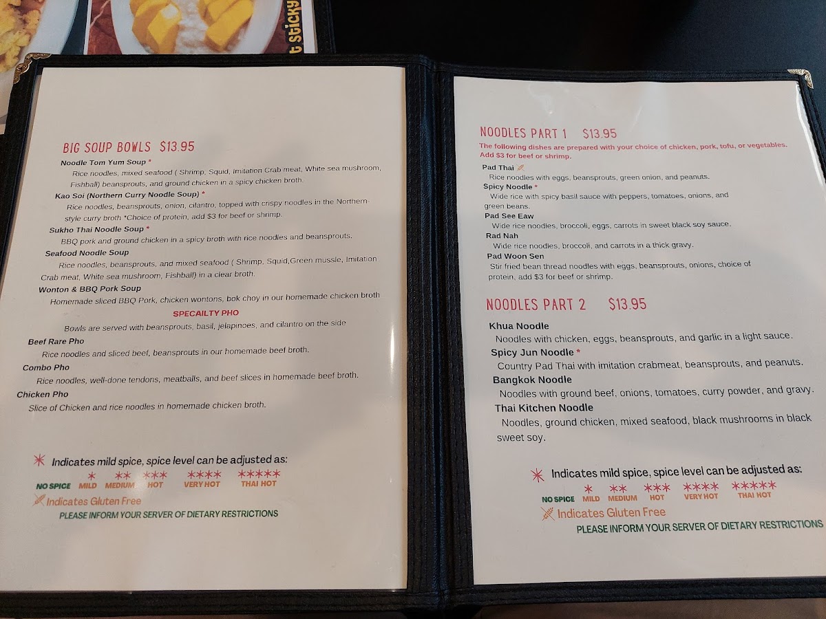 The menu is a treasure trove of Thai favorites, and it is hard not to be tempted by its diverse offerings. Dive into the Kao Soi, a noodle dish that presents a perfect harmony of soft rice noodles and zesty broth, topped with crispy noodles—a true feast for both the eyes and the palate. At just $13.95, it’s a steal considering the generous portion size.